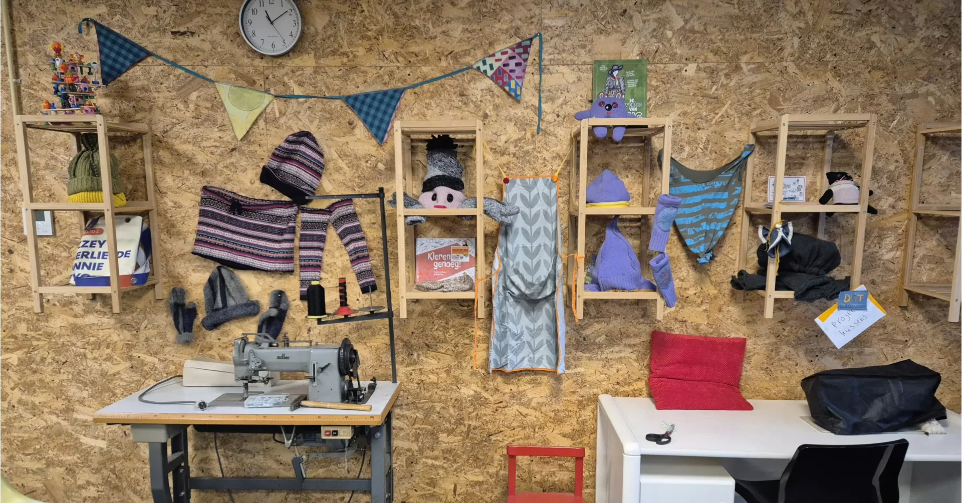 Met de S’tofprojecten zijn we afgelopen wintermaand met een perfect bijpassende opdracht bezig geweest. Namelijk het maken van verschillend wintergoed zoals mutsen, beenwarmers en wanten van oude kleding. De truien die te versleten zijn om bij de kledingruil in de rekken te hangen, hebben wij een nieuw leven gegeven. Dit doen we door patronen op de truien te leggen en de vormen vervolgens onder de naaimachine aan elkaar te naaien. Met gebruik van een stretchsteek kan de elastische stof mee rekken. De stof kan ook met de hand aan elkaar worden geregen, hetgeen alleen iets meer tijd kost.
